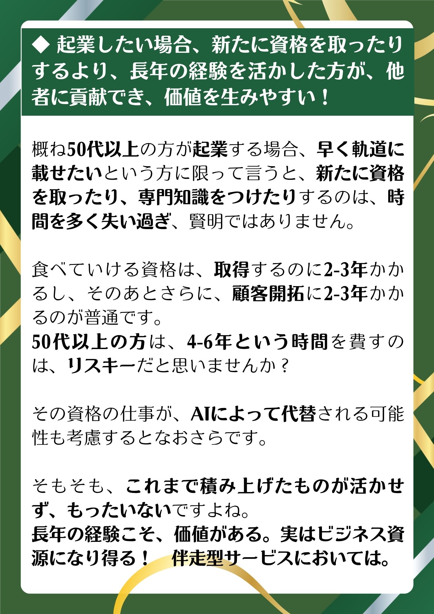 ✔ 第二の人生で起業したい場合、今から、新たな資取得などに貴重な時間を費やさなくても、長年の人生・職業経験、知識などの中から、起業に使える資源を見つけ出し、そうした資源を活かした、寄り添い型サポートの「自分のサービス」を作って起業するのが有効かつ合理的!