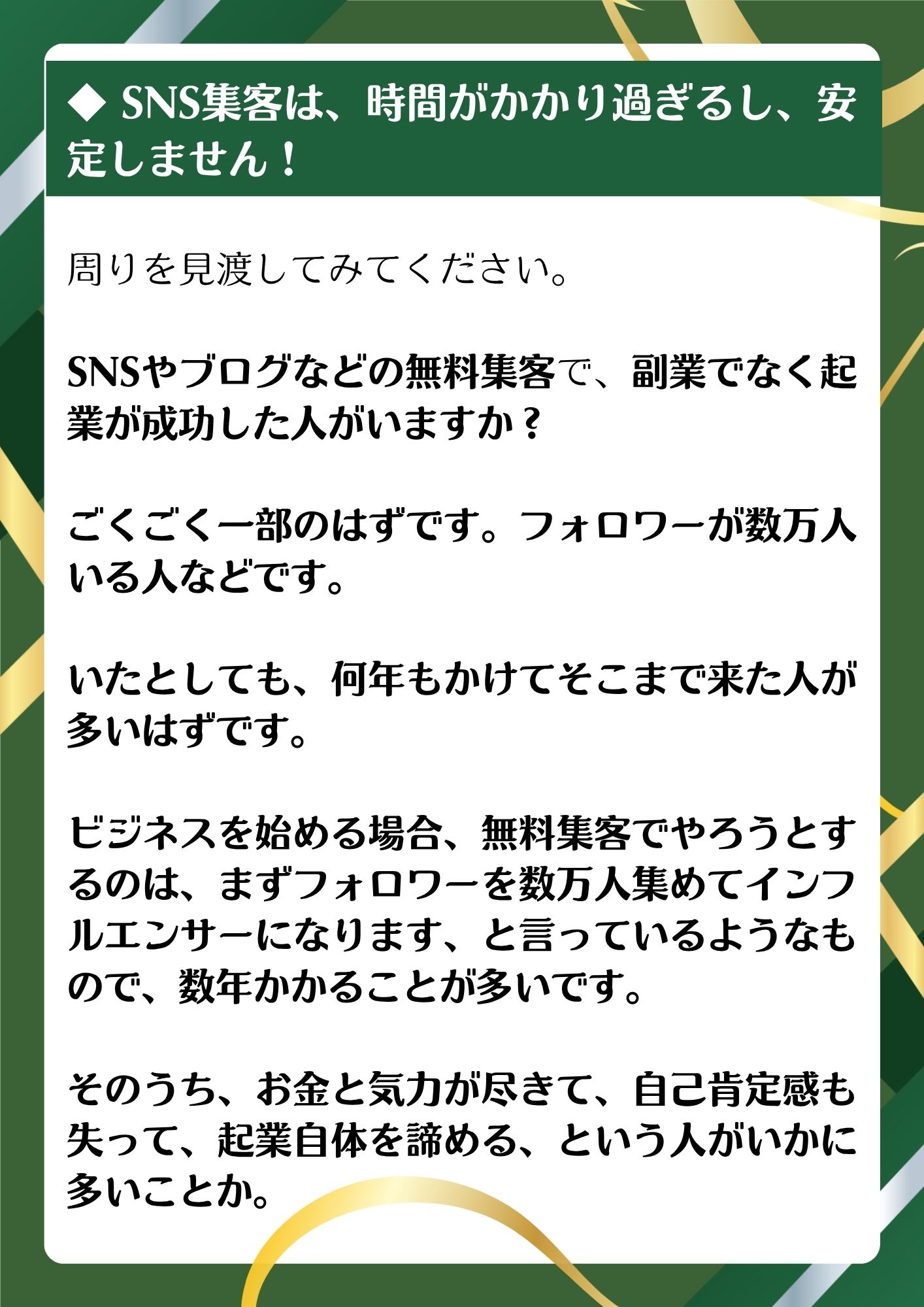 ✔ 多くの人は、事業の内容そのものはよく考えるものの、集客の具体的な方法をしっかり詰めず、SNS投稿やブログなどに飛びつき、結局、投稿をいくら頑張っても契約を勝ち取るところまでは行かず、そのうち、お金と気力が尽きて、起業を諦めてしまいがち。
