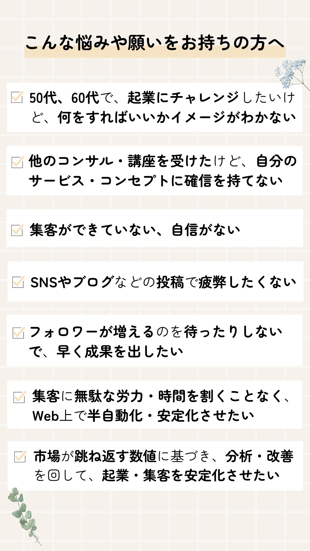 ✔ ビジネスやWeb集客の仕組みを形だけ作っても、各種の集客率の数値が高くならず、収入は安定化しない!